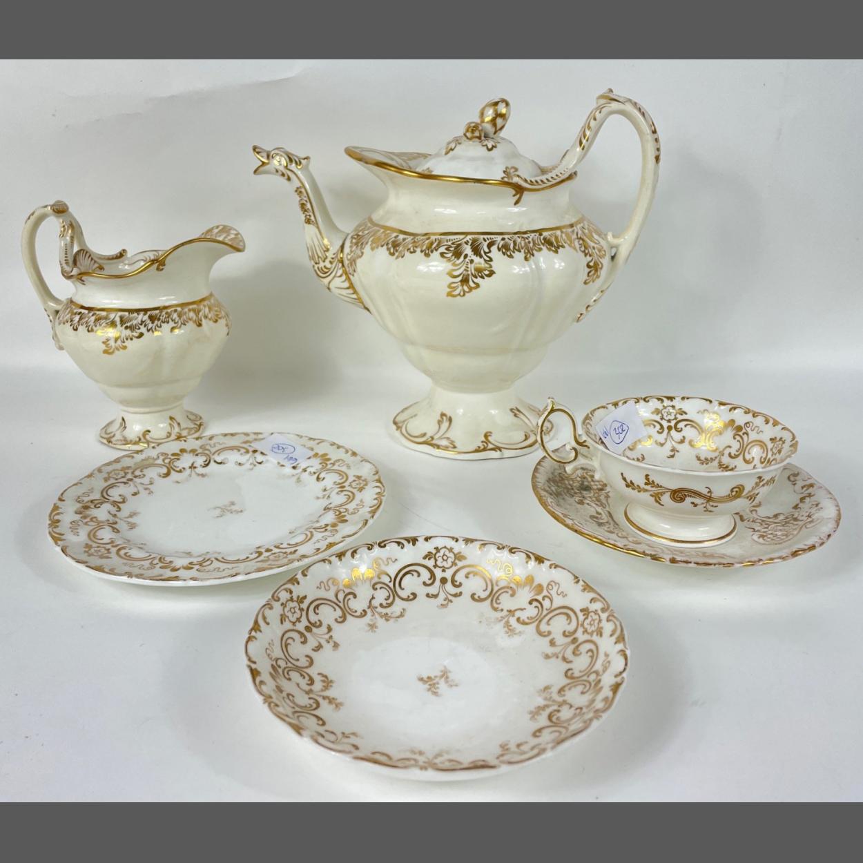 19th Century STAFFORDSHIRE pottery teapot, a lobed body with HoHo bird spout and acorn finial, with printed decoration highlighted in gilt flora dimensions height 24cm width 26cm approx - with a matching large milk jug 16cm height, and similar matching cup, saucer, small shallow bowl and sideplate