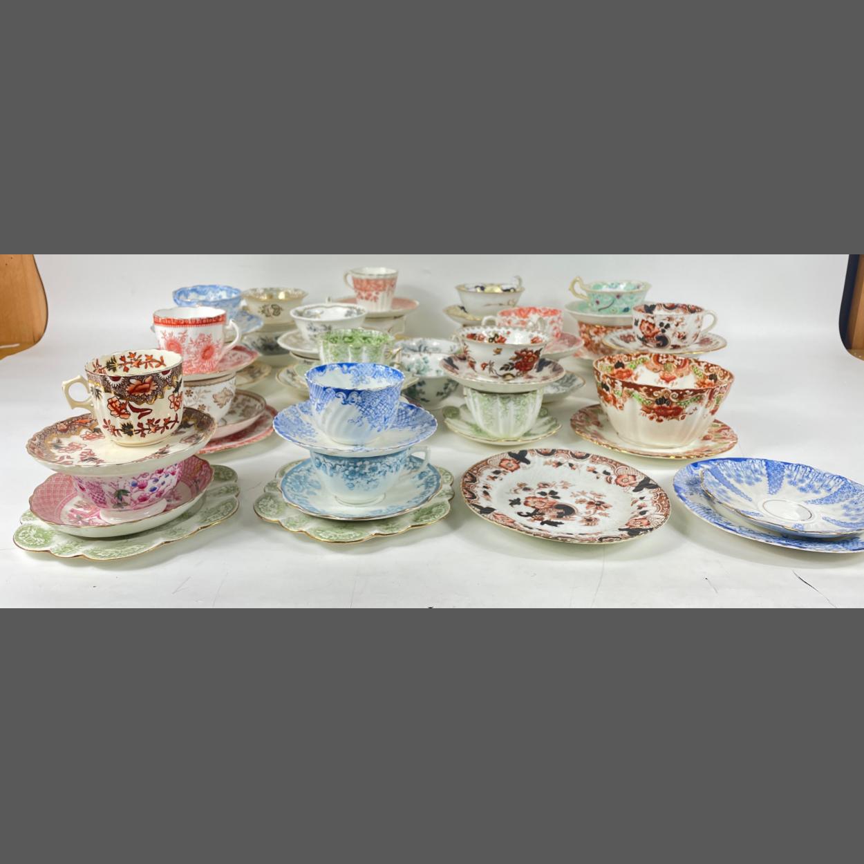 Around 20 19th Century one cup and saucer different sets of fine bone china, some amazing RARE patterns, a two cup and saucer white and green set included, such names as Embassy ware, Copeland Garret, Felspar Porcelaine, Foley Davenport and much more