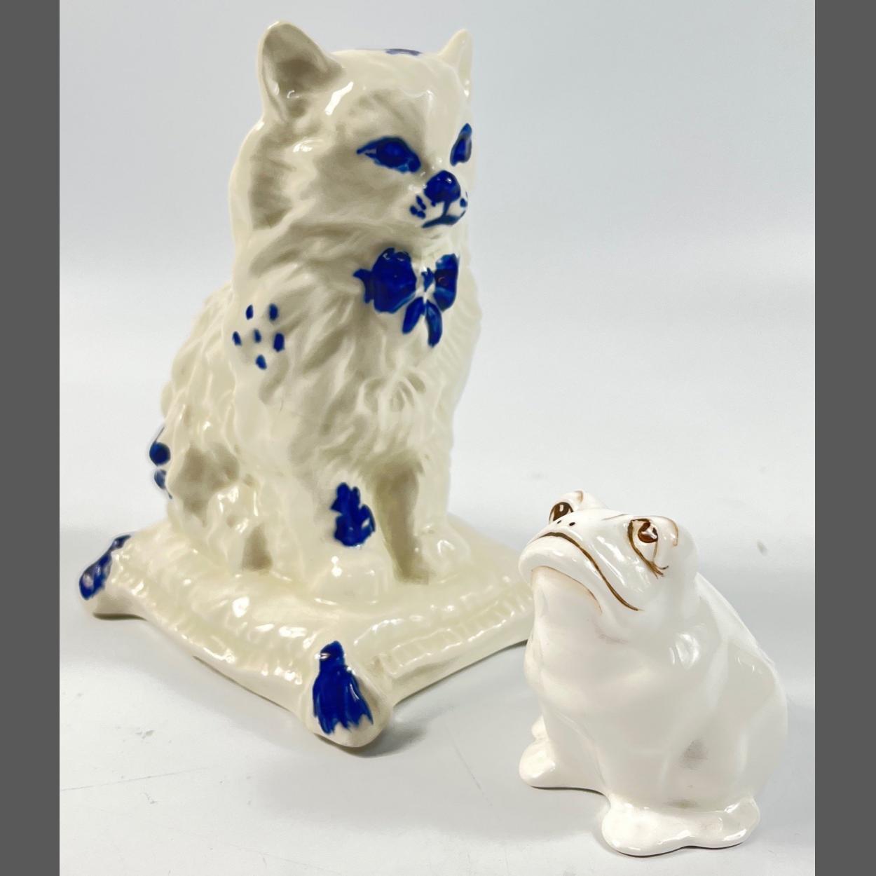Early c20th Century THE FROG AND THE CAT - a sitting Persian style cat on a cushion ornament - dimensions 15.5cm height 8cm width and a small white Bone China sitting frog ornament by COALPORT(SO CUTE!) - dimensions 6.5cm height 5.5cm width approx