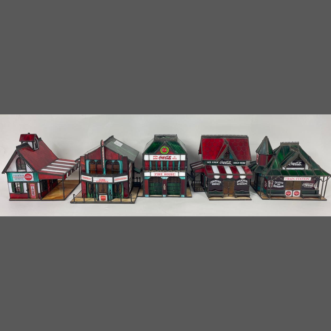 COCA COLA - a Franklin Mint STAINED GLASS VILLAGE to include eight buildings being a 1999 Movie House, a 1999 Ice Cream Parlor, a 1998 Firehouse, a 1997 Gas Station (small crack on one panel on roof), a 1997 Train Station, a 1995 Corner Store, a 1997 Victorian Hotel, a 1999 Antique Store etc
