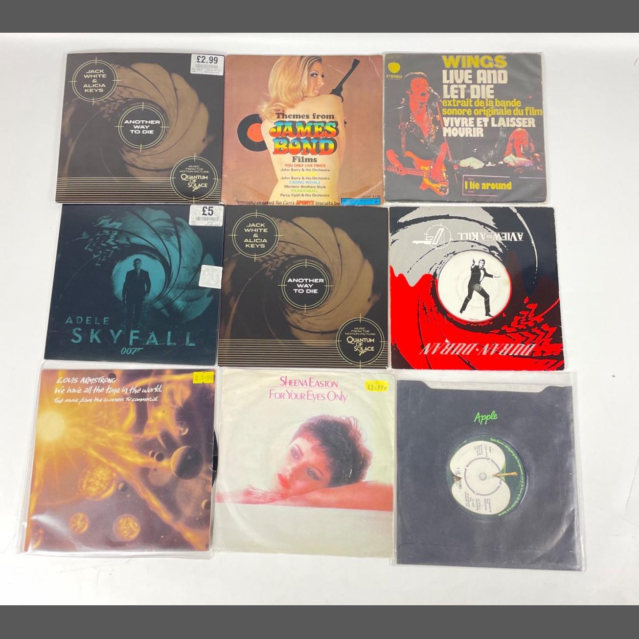 A selection of 45s featuring JAMES BOND theme tunes to include Live and Let Die & The French Version, For Your Eyes Only, A View to a Kill, Skyfall, Another Way to Die x 2 and an EP of JAMES BOND Films