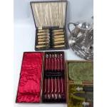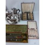 EPNS lot to include cased Christopher Johnson carving set in fitted case, attractive red lined teaspoon and nips set, two cased knife and fork sets, six Rome teaspoons in box with wolf Roma finials and a Walker & Hall tray with matching tea and coffee pots and a water jug. Some damage.