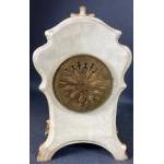 Antique brass faced clock in ceramic floral case. Rubbing to gilding but otherwise in very good condition, no key. 35cm tall approx.