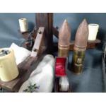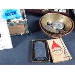 Mixed lot to include wooden chandelier, box containing calligraphy supplies, a vintage ZIPPO lighter in box, a silver napkin ring in holder, a steamer, a backgammon set, a boxed set of cutlery and two matching trench art shells and various other items