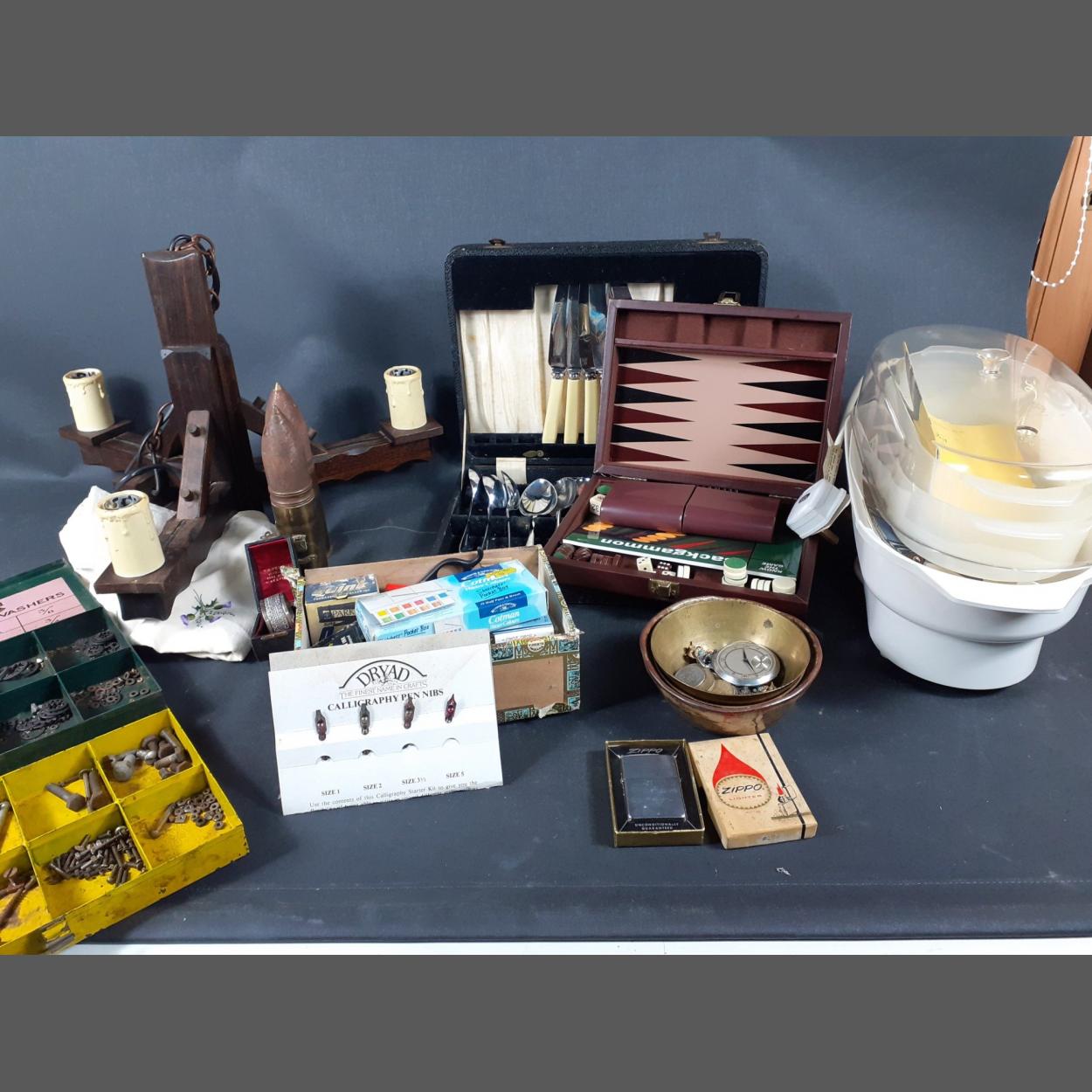 Mixed lot to include wooden chandelier, box containing calligraphy supplies, a vintage ZIPPO lighter in box, a silver napkin ring in holder, a steamer, a backgammon set, a boxed set of cutlery and two matching trench art shells and various other items
