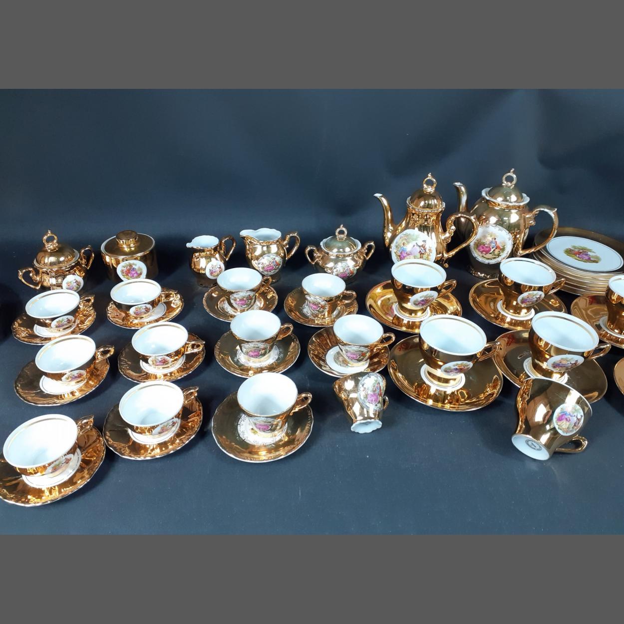 A vintage BONDWARE gilt Vintage Fine China Porcelain tea and coffee set to include 7 teacups, 6 coffee cups, 6 saucers (15cm), 6 saucers (11cm), 6 plates (17cm), 1 cake plate (24cm), 2 lidded sugar bowls, 1 coffee pot plus a further gilt coffee set made in Japan to include 6 cups, 4 saucers, 1 bowl, 1 milk jug, 1 lidded sugar bowl, 1 teapot, some fading to the gilt