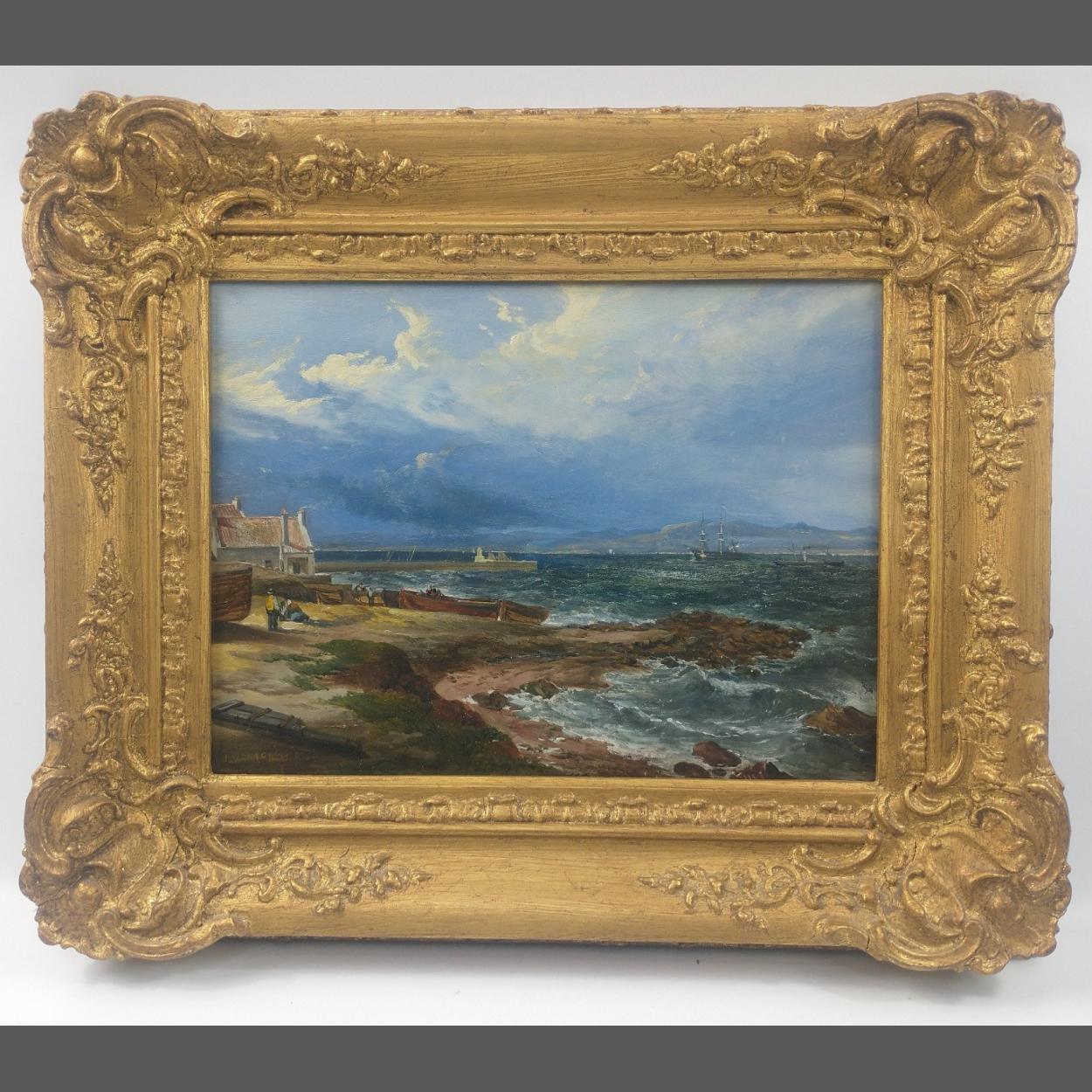 JOHN WATSON MCLEA SCOTTISH 1842-1861 Fisherfolk on the Foreshore by The Pier at Newhaven / oil on board signed and dated 1861 dimensions 29cm x 22cm within a gilt frame / cost £2k Carlton Gallery