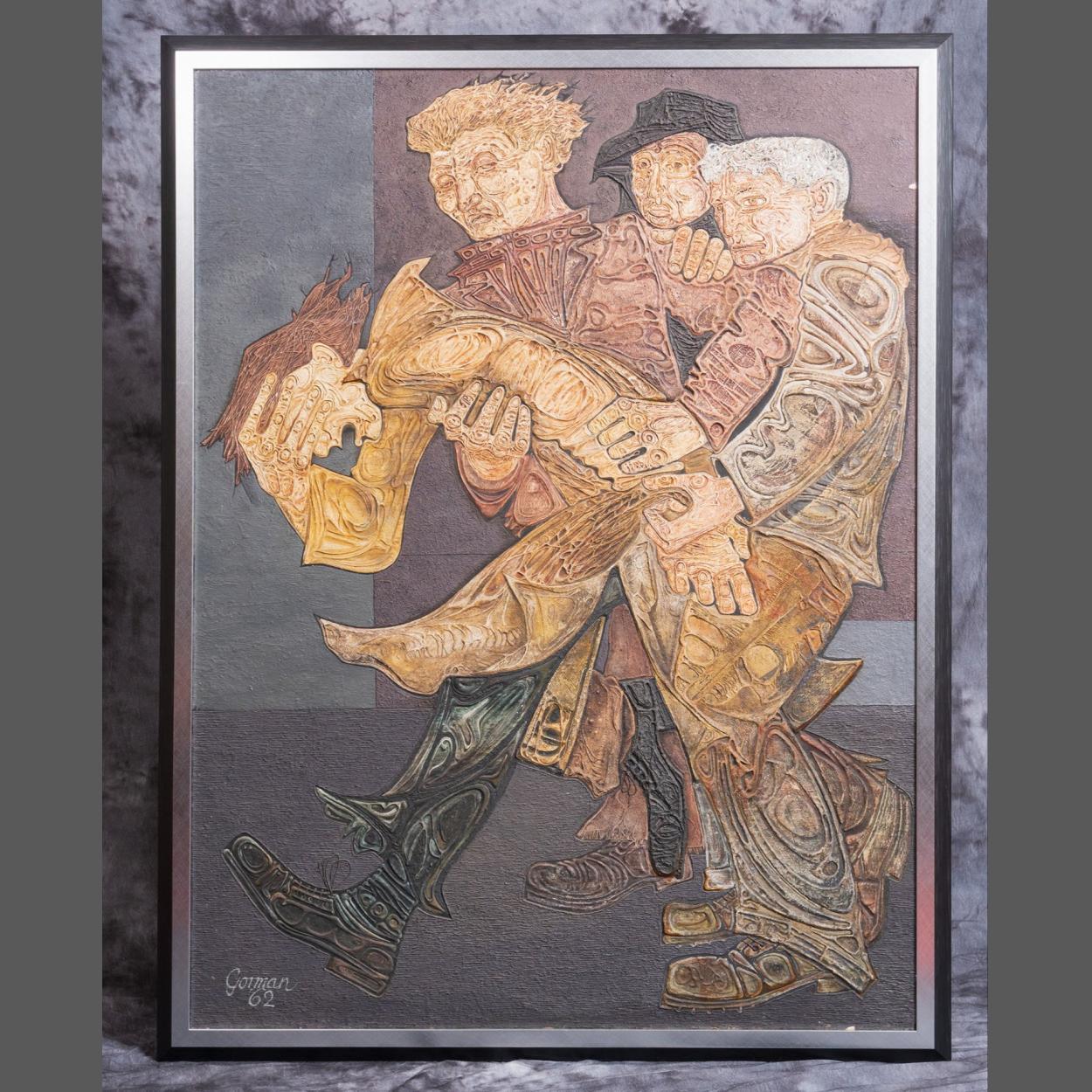LARGE painting by JAMES GORMAN Glasgow School Of Art mixed media THE CAPTIVE depicting Glasgow Gang Culture dimensions 1m wide x 1m30cm height approx