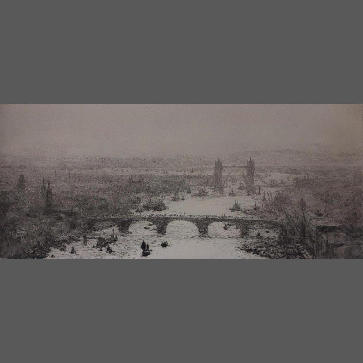 By WL WYLLIE (1851 – 1931), an etching on paper, signed in pencil by the artist, showing the building of Tower Bridge, London frame size 55x36cm,visible work 37x17cm. One of a set of three similar scenes by the artist always displayed together and offered for sale individually.