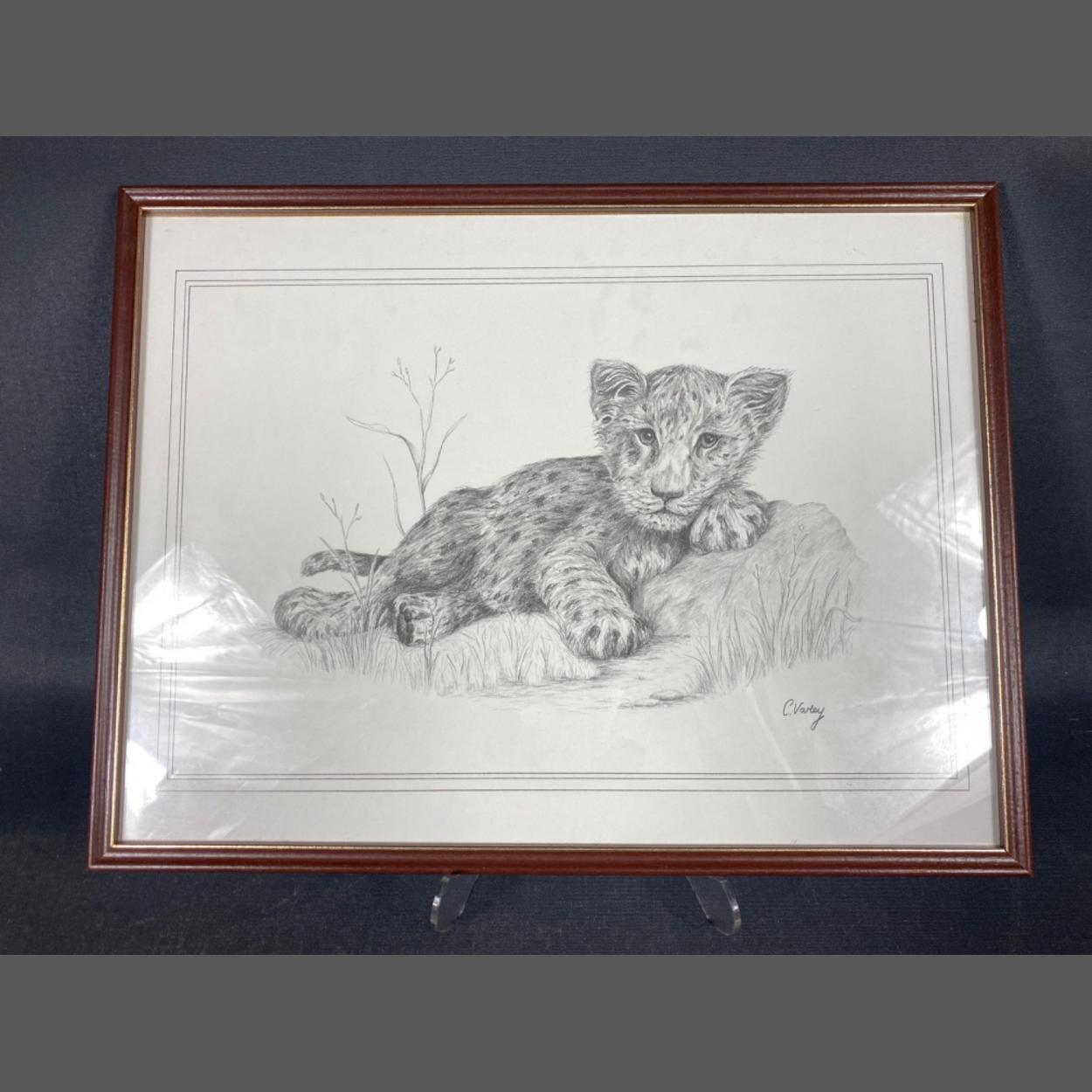 A vintage c1960 framed print of pencil drawing of a lion cub by C. Varley 43 x32cm