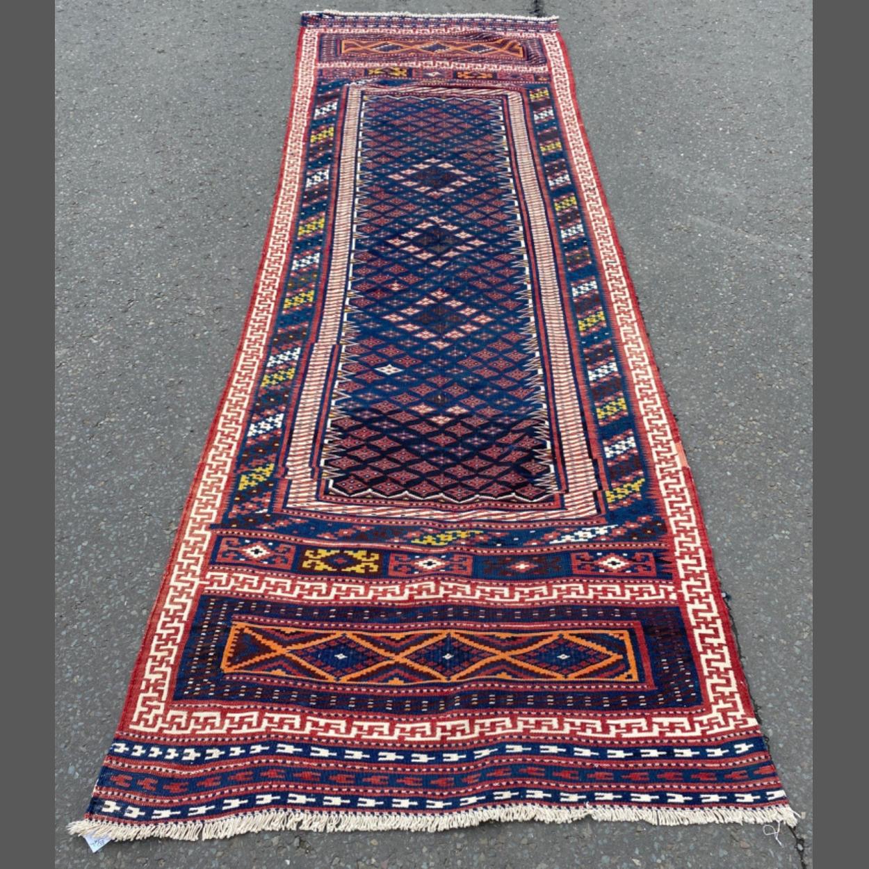 A stunning vintage Afshar Sofreh Kilim, a tribal piece from Southern Persia. A Sofreh rug would have been spread on the floor and used for serving food, rather than using a table. There are many exciting elements in this piece, like the vibrant colours, geometric designs and fine finishings.