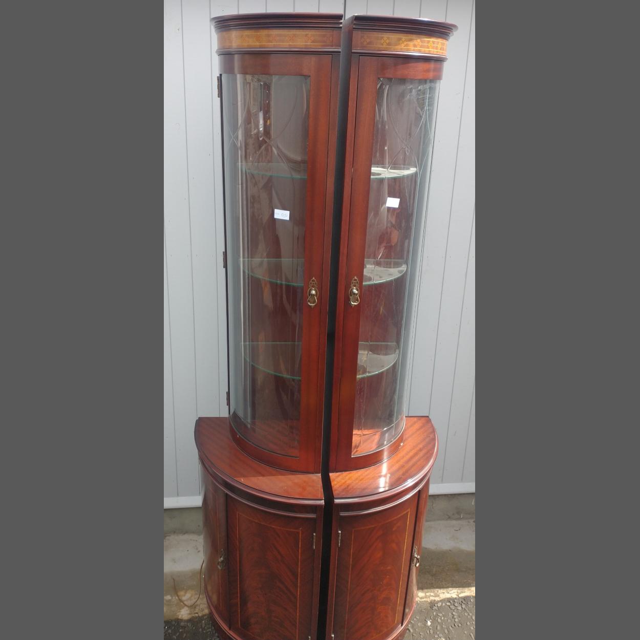 A pair of dark wood glazed corner display cabinets with two cupboard doors / / height 195cm x width 40cm each approx