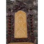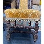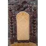 An IMPRESSIVE pair of Victorian Jacobean style wooden turned and hand carved chairs with excellent engraved bird and wildlife scenes. Plush gold fabric to seat pads and backs. 115cm tall approx.