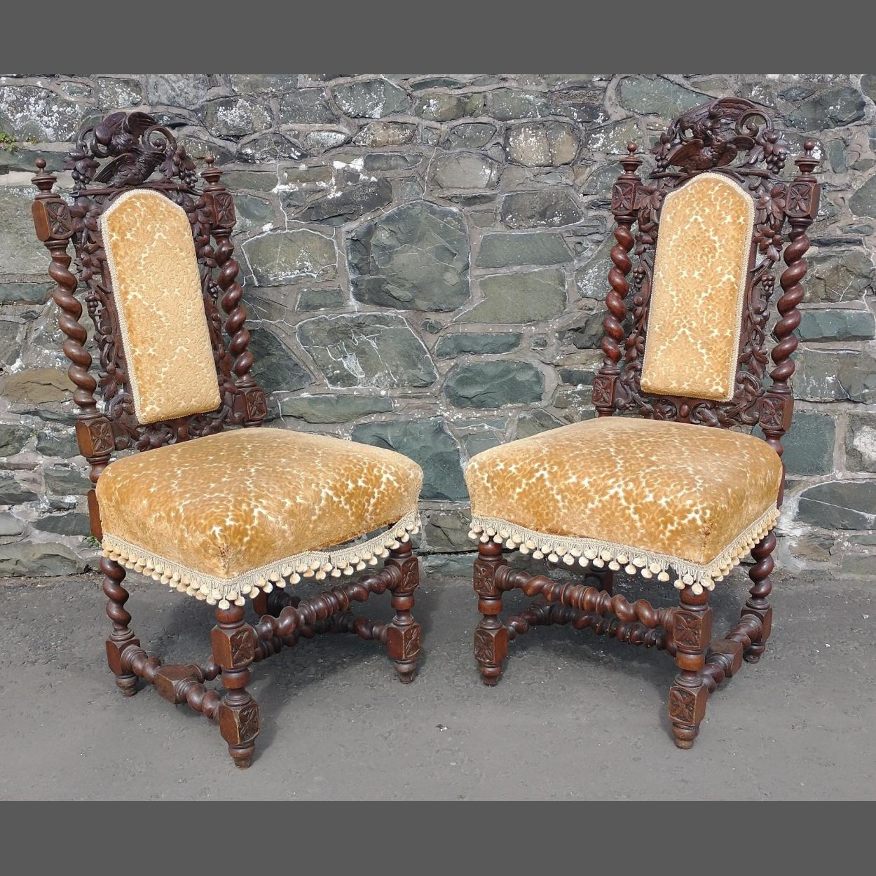 An IMPRESSIVE pair of Victorian Jacobean style wooden turned and hand carved chairs with excellent engraved bird and wildlife scenes. Plush gold fabric to seat pads and backs. 115cm tall approx.