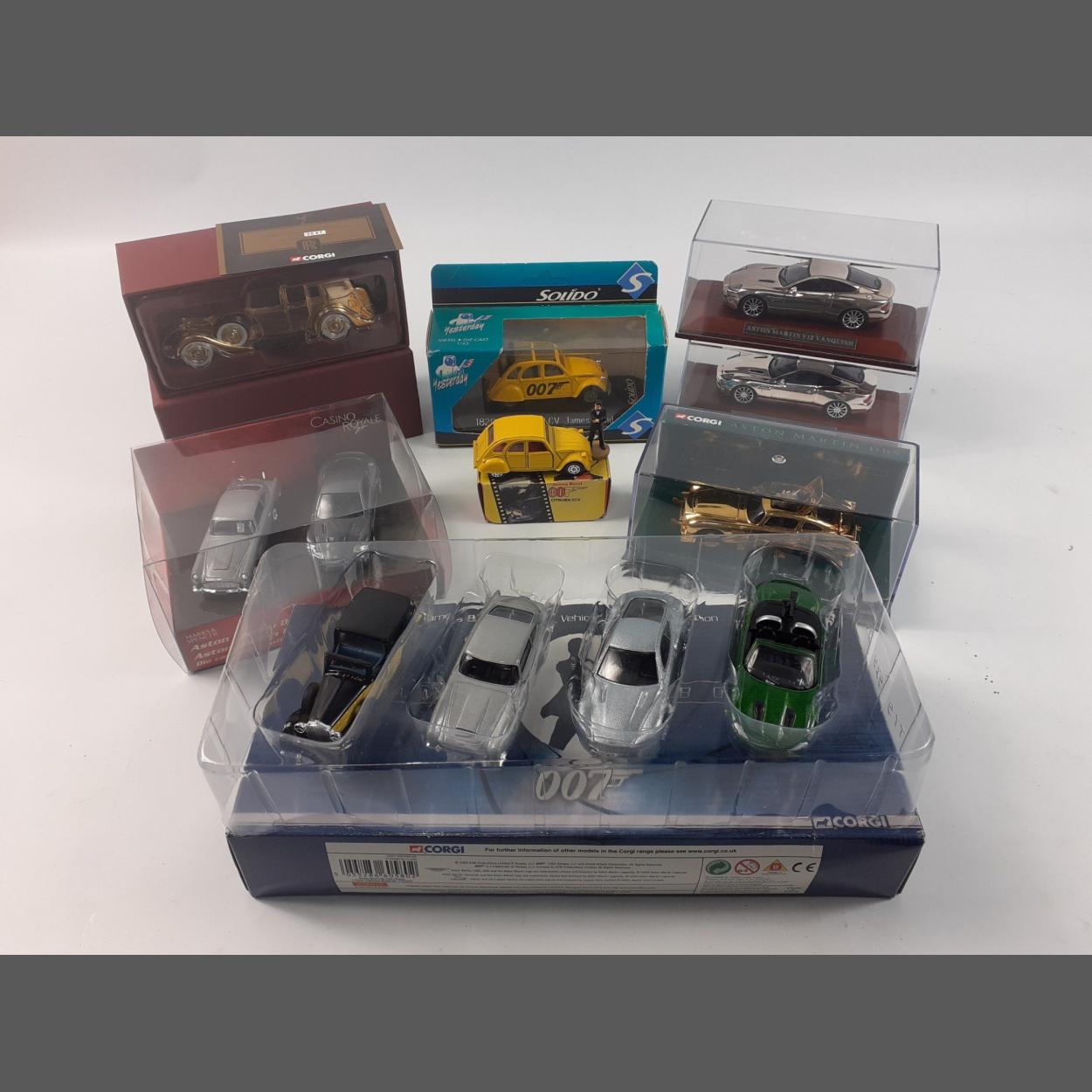 A collection of JAMES BOND boxed model cars to include a CORGI Citroen 2CV and a similar by SOLIDO a CORGI boxed set of 4 DIE CAST cars from Goldfinger and Die another Day, two small ASTON MARTIN V12 VANQUISH presented in perspex cases , a gold Corgi ASTON MARTIN DB5 and two ASTON MARTINS produced for M&S. also includes An unopened limited edition CORGI Gold Plated 1937 ROLLS ROYCE Sedanca De Ville the 13cm model is number 3647 of a worldwide edition of 5000 and comes with certificate