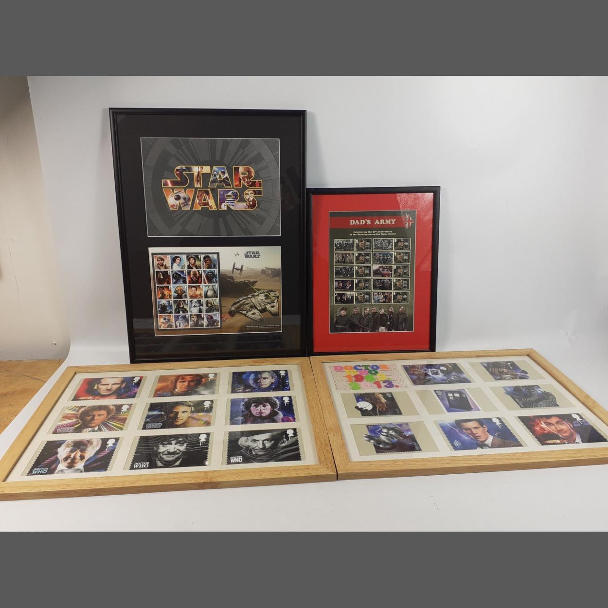 ROYAL MAIL special issue stamps to include STAR WARS: Ultimate Edition (frame size 57x41cm approx), DAD'S ARMY celebrating 50 years (frame size 40x31cm approx), and a collage of 1st class stamps celebrating the first nine DOCTOR WHOs (frame size 55x40cm) and a further collage taken from various Doctor Who stamps celebrating 50 years (frame size 55x40cm)