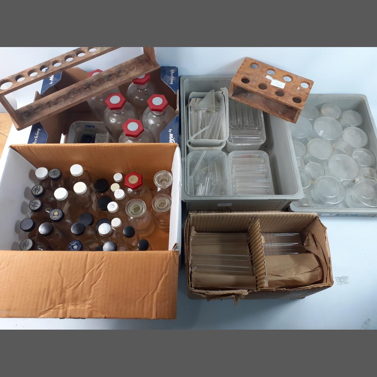 A large collection of CHEMISTS GLASS WARE to include several boxes of Pyrex branded test tubes in various sizes half filled box of BOROSILICATE GLASS 6" x 1" test tubes dated 1957 old wooden tube stands and 3 boxes of varoius chemists glass bottles and dishes