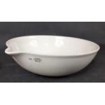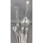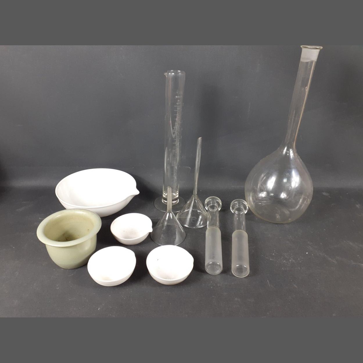A box of mixed CHEMISTS GLASS and mixing dishes to include an example by Royal Worcester with a diameter of 18cm also a 39cm tall 2000ml glass flask 2 glass funnels and various other items