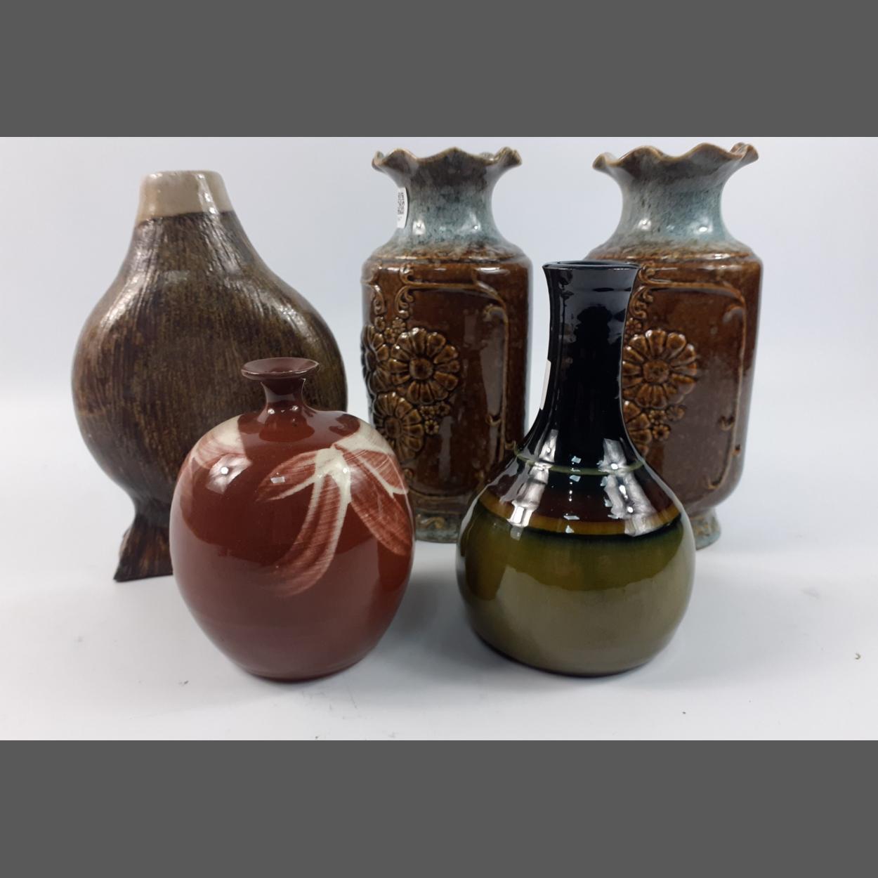 5 pieces of STUDIO POTTERY a pair of 22cm tall vases an unusual onion shape flask vase and two smaller vases