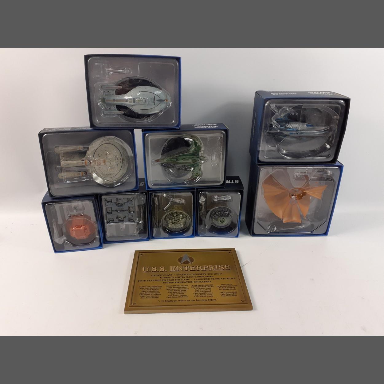 STAR TREK - collectable die-cast models by EAGLEMOSS to include Suliban cell ship - (5555-A/A), Fesarius (6240-A/A), Borg Tactical Cube (8882-A/A), Borg Sphere (0082-A/D), USS Enterprise NCC-1701-D (AGT) (4209-A/A), Xindi Insectoid Vessel (6213-A/I), USS Voyager NCC-74656 (4852-A/B), Orion Interceptor (0064/A/A), Bajoran Lightship (9504-A/B), a plaque commemorating USS ENTERPRISE NCC-1701-D (21x16cm approx)