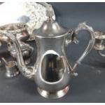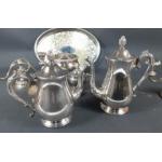 A collection of white metalware to include a matching service of coffee pot (25cm high), teapot (23cm) jug and lidded sugar bowl, a pair of candelabra (15cm high), a silver-plated rose bowl (13cm high, dia approx 16cm), a mustard dish minus glass liner and a pierced tray 39cm long