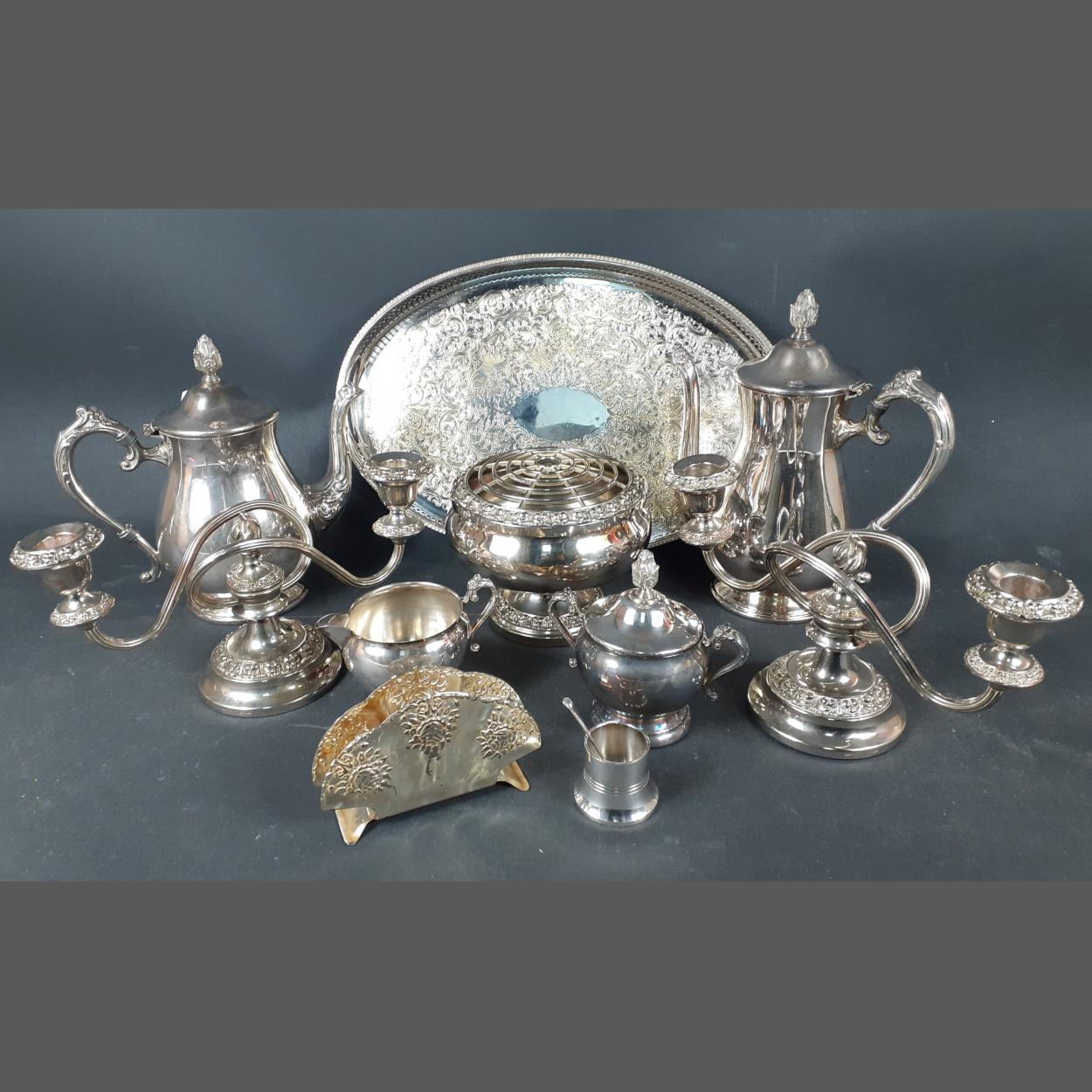 A collection of white metalware to include a matching service of coffee pot (25cm high), teapot (23cm) jug and lidded sugar bowl, a pair of candelabra (15cm high), a silver-plated rose bowl (13cm high, dia approx 16cm), a mustard dish minus glass liner and a pierced tray 39cm long