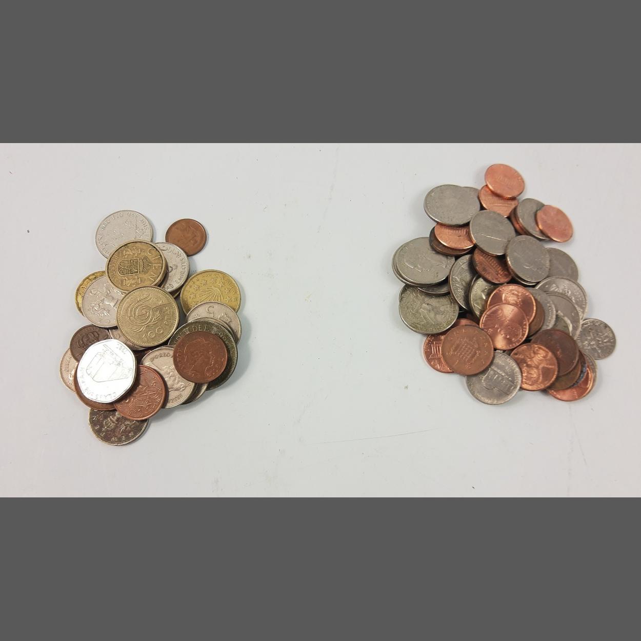 A bag of USA coins including 1 cent, 5 cent and 25 cents plus another bag with 'old' 5p coins and various European coins