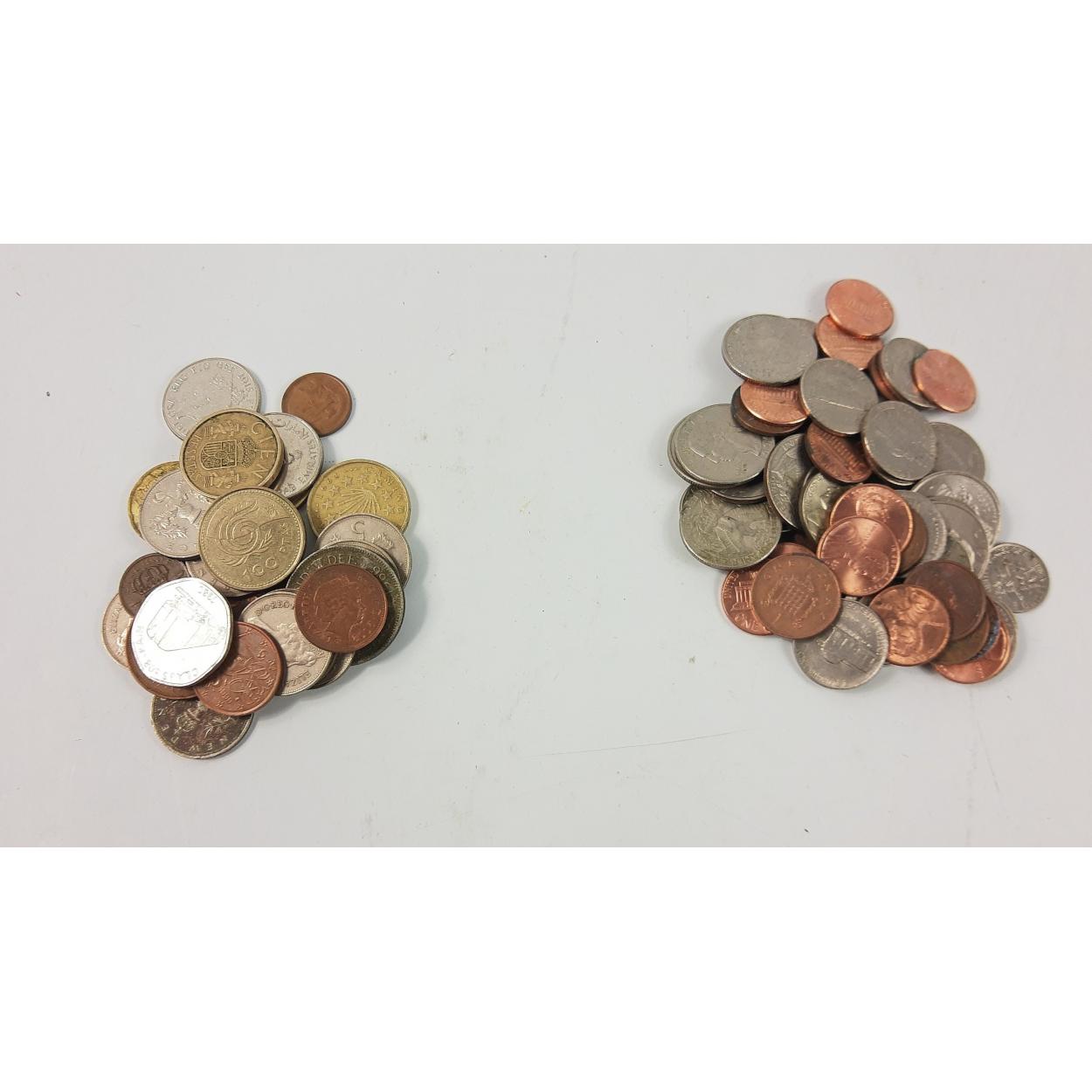 A bag of USA coins including 1 cent, 5 cent and 25 cents plus another bag with 'old' 5p coins and various European coins