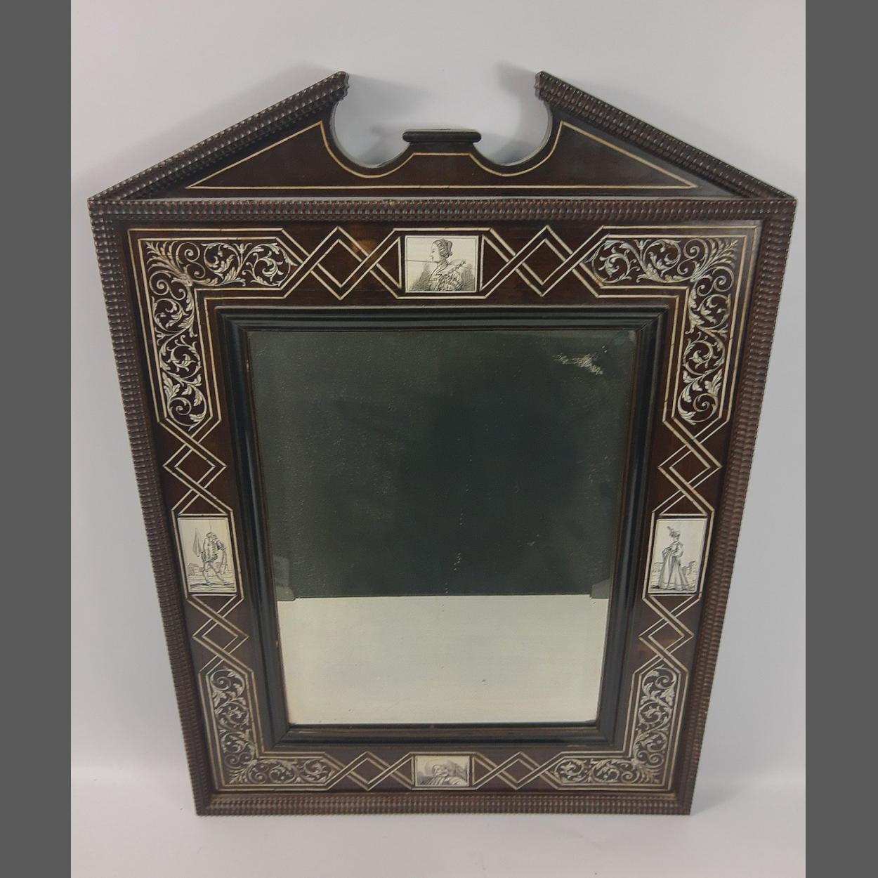 An attractive reproduction mirror with inlaid marquetry and ivorine panels frame measures 62x46cm approx