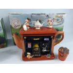 A TEAPOTTERY Jubilee Range brown teapot, a green range teapot from the TEAPOTTERY, and a BESWICK cottage-shaped butter/cheese dish 20x13cm high approx),