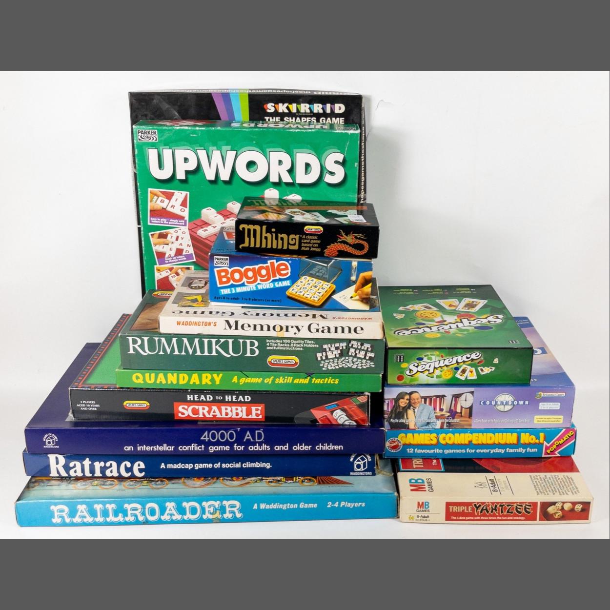 A collection of mainly vintage board games to include Railroader, Ratrace, 4000A.D., Head to Head Scrabble, Upwords, Rummikub, Skirrid, Quandary, Sequence, Waddington's Memory Game, a Games Compendium, Countdown, Yantze, Mhing, Boggle