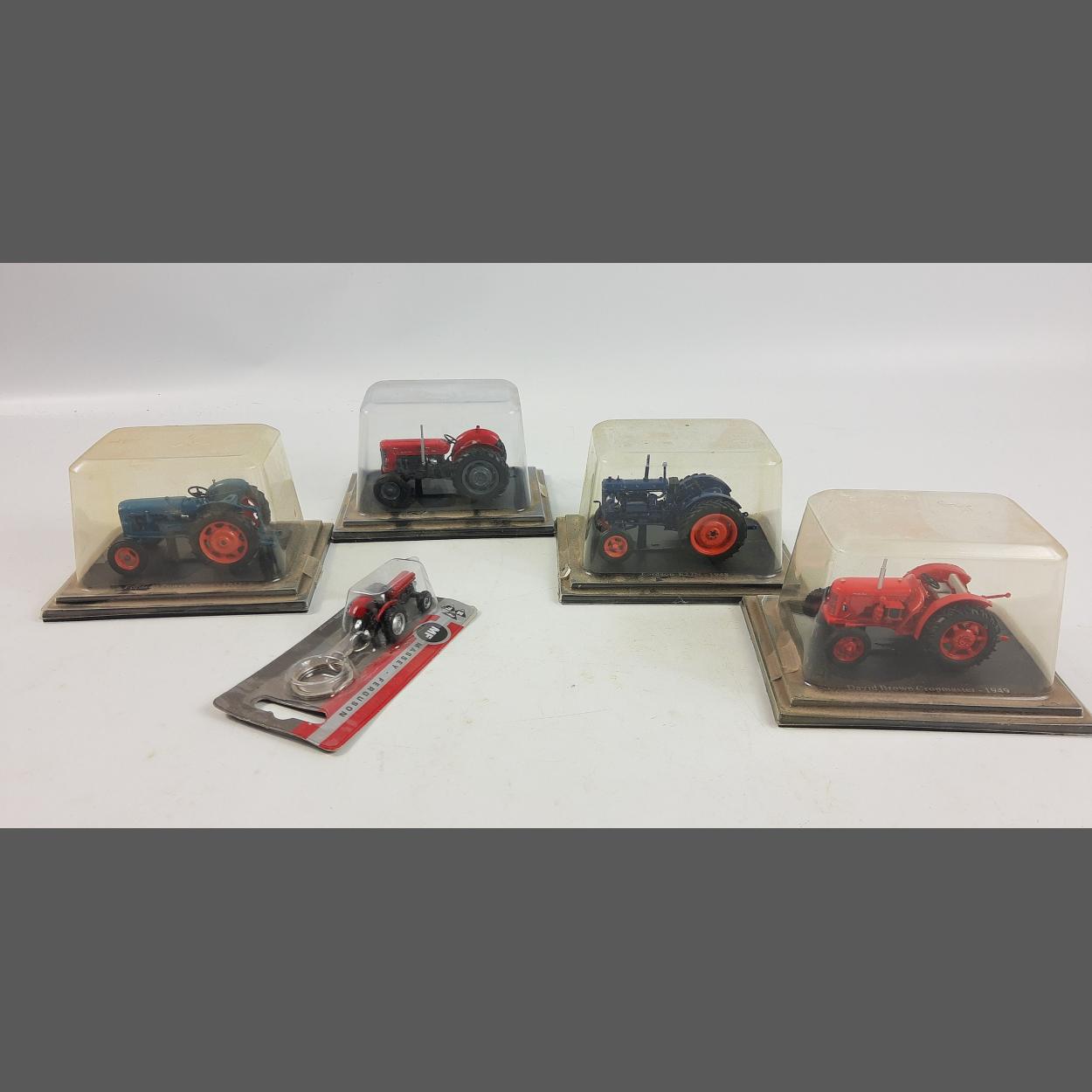 Four cased collector's models of tractors to include a Fordson Power Major - 1958, Massey Ferguson 65 - 1959, Fordson E27N - 1948, David Brown Cropmaster - 1949, and a Massey Ferguson retro range keyring