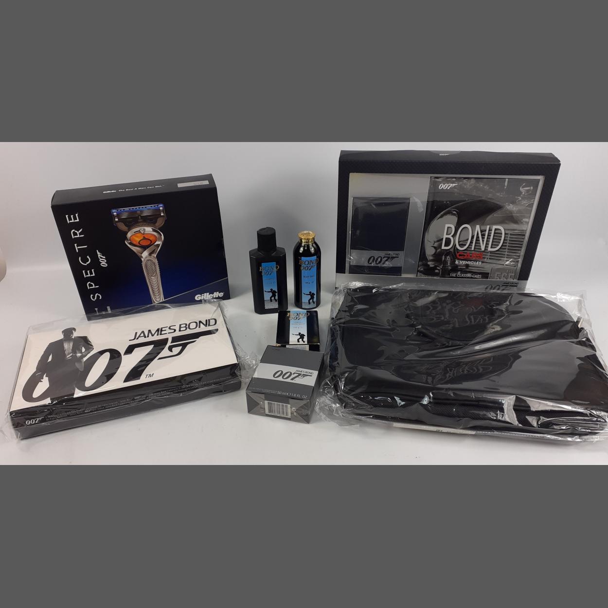 JAMES BOND toiletries to include an unopened SPECTRE razor by Gillette, 007 shampoo, bath soap, body talc, a sealed box of 50ml eau de toilette, and an unopened CASINO ROYALE wash bag to put it all in, plus a sealed presentation pack of the book of Bond Cars & Vehicles along with a 125ml bottle of James bond 007 eau de toilette, and a 007 laptop bag still in wrapper