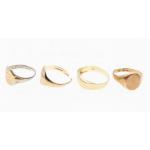 FOUR rings, TWO 375 stamped yellow gold gents rings, one which has been cut through, gold weight 4.69g approx ring sizes V approx, an unmarked yellow metal signet ring size R 4.28g approx(passes the magnet test) and a gold on silver plated signet ring size S weight 3.98g approx