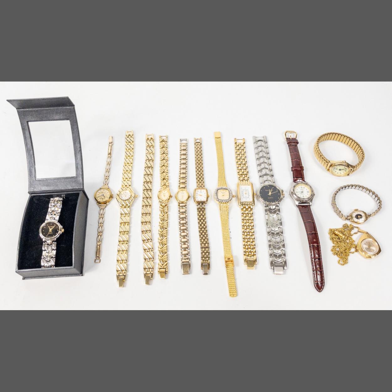 A large QUANTITY of dress everyday ladies yellow metal bracelet watches to include such brands as LIMIT and ACCURIST etc etc