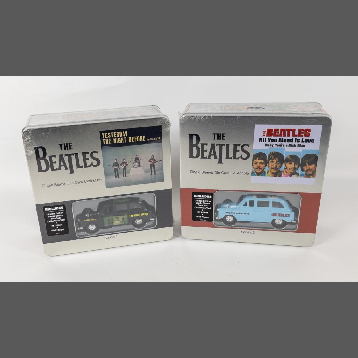THE BEATLES single sleeve die cast collectible Series 1 tin with a limited edition black London cab with ITALIAN decal - dal film aiuto for the film 'Help!', also an XL t-shirt, wall plaque, still shrink-wrapped and a Series 2 single sleeve die cast collectible tin with a blue taxi cab with Baby, You're a Rich Man decal, also XL t-shirt, wall plaque still shrink-wrapped