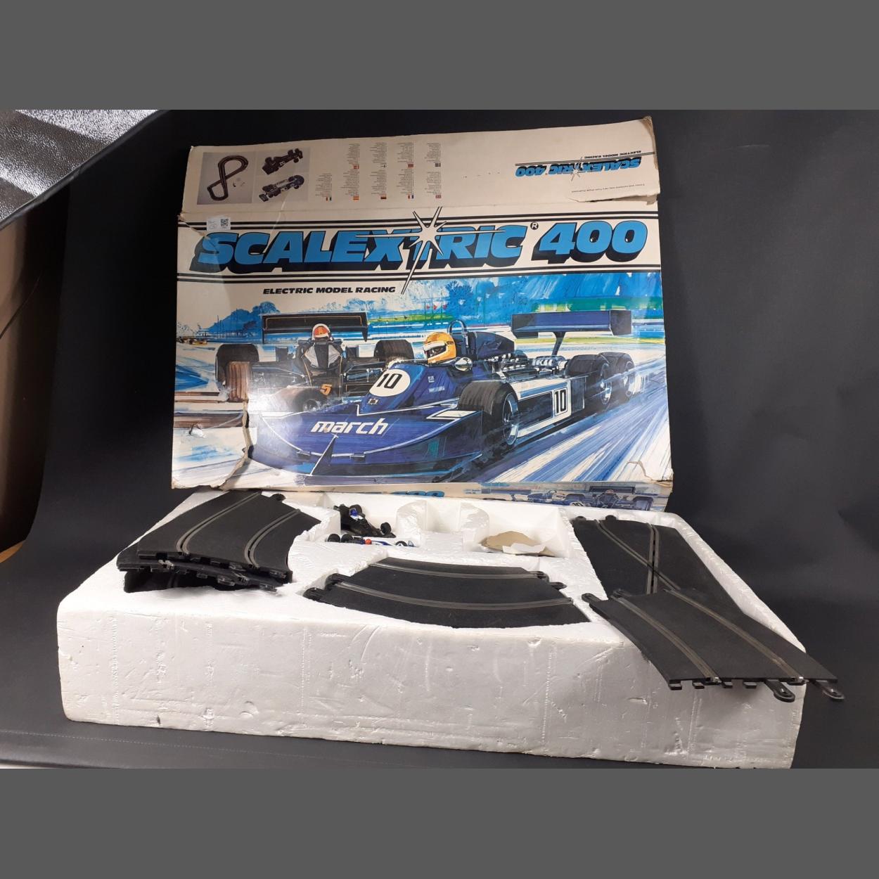 A part 1979 SCALEXTRIC 400 set (C536) minus power unit but including 3 cars and multiple stretches of track, box in poor condition
