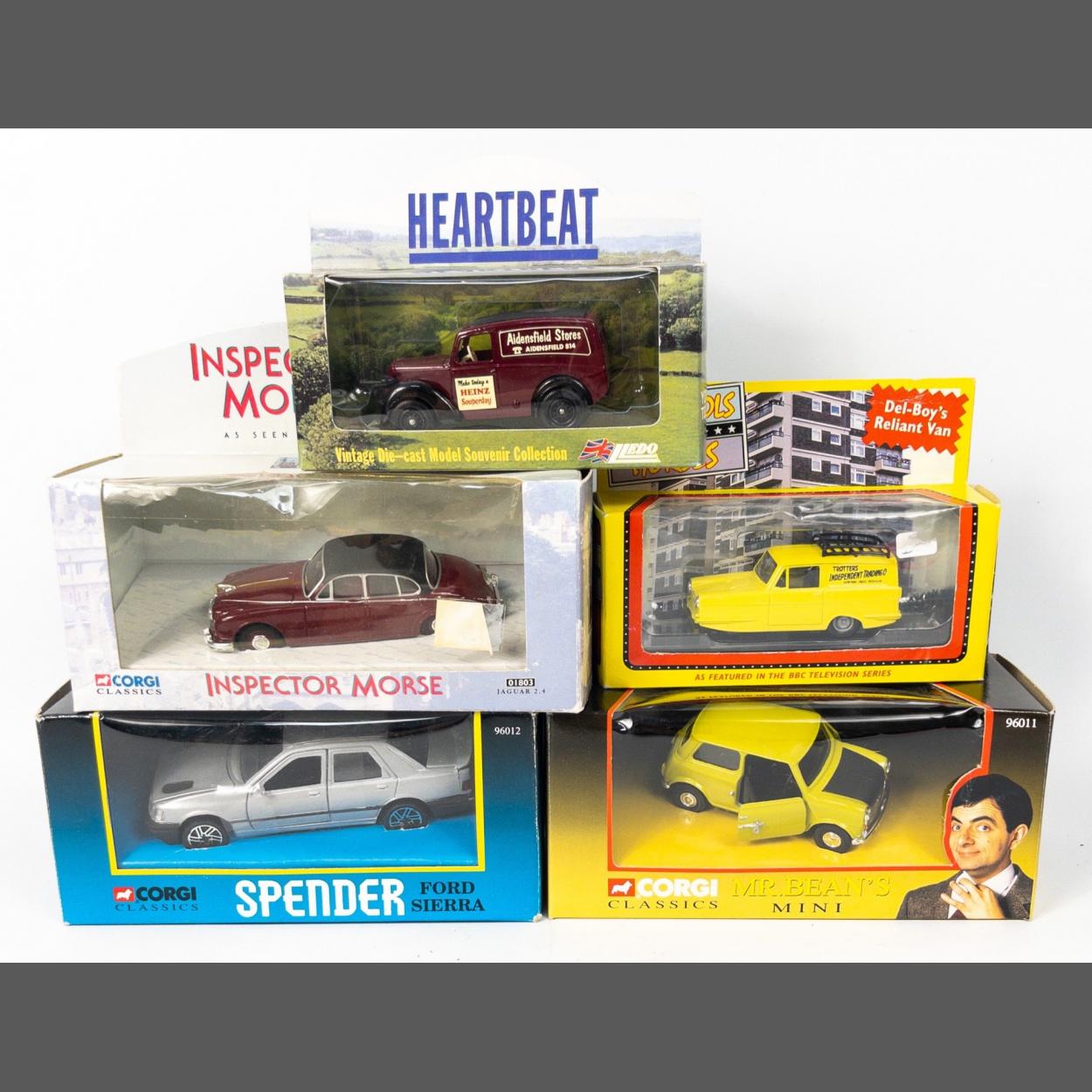 Boxed as new diecast model cars from TV favourites to include from ONLY FOOLS AND HORSES- Del-Boy's Reliant Regal Supervan III by Lledo (1:43 scale), from HEARTBEAT an Aidensfield Stores van by Lledo, from MR BEAN - Mr Bean's Mini by Corgi Classics (96011), from SPENDER - Ford Sierra by Corgi Classics (96012), from INSPECTOR MORSE - Jaguar 2.4 by Corgi Classics (01803 damage repaired to box), ,