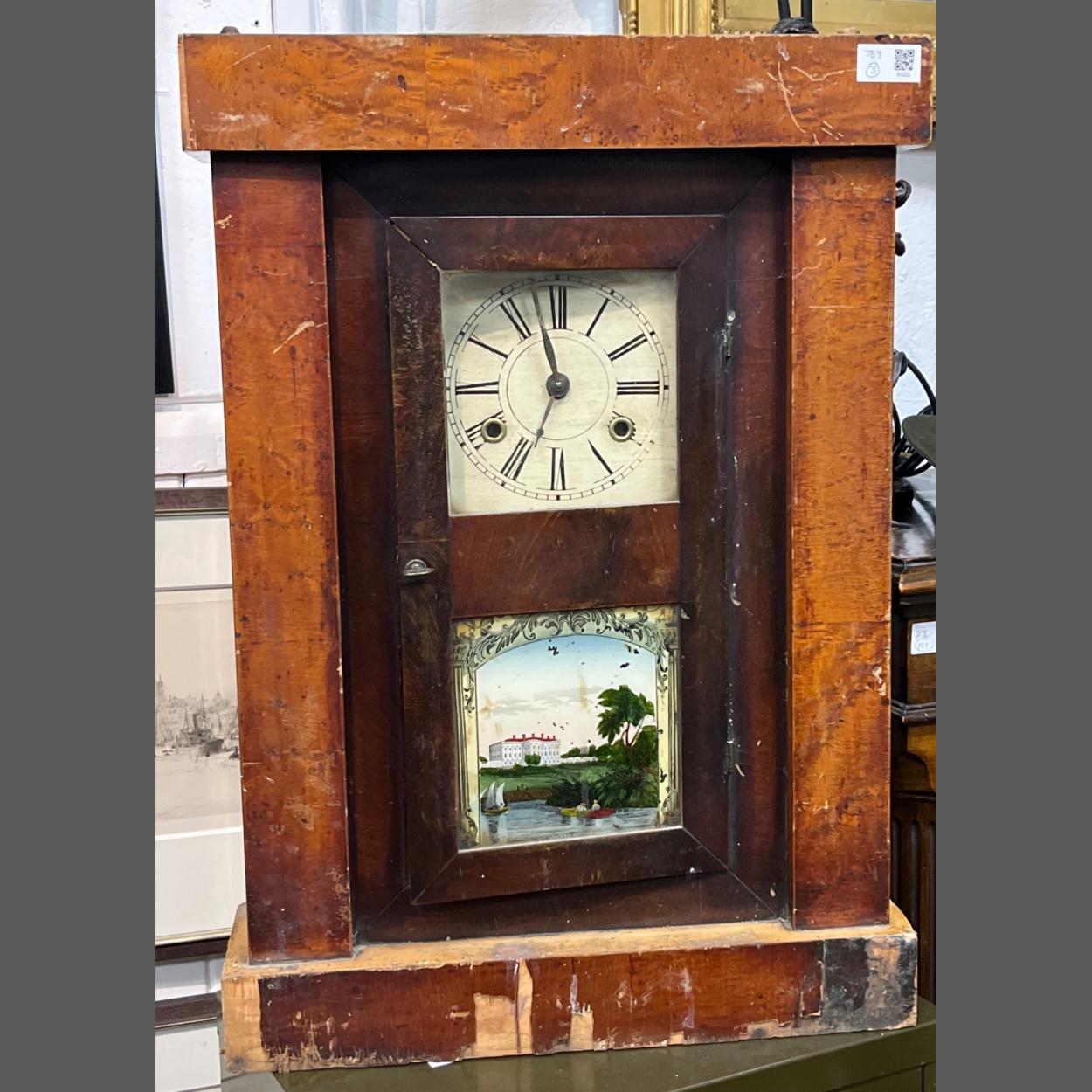Interesting antique CHAUNCEY JEROME 8 Day wood cased clock with nice reverse painted glass panel depicting ''Presidents House''. This appears to be a mid nineteenth century depiction of the Whitehouse and has been attractively done.