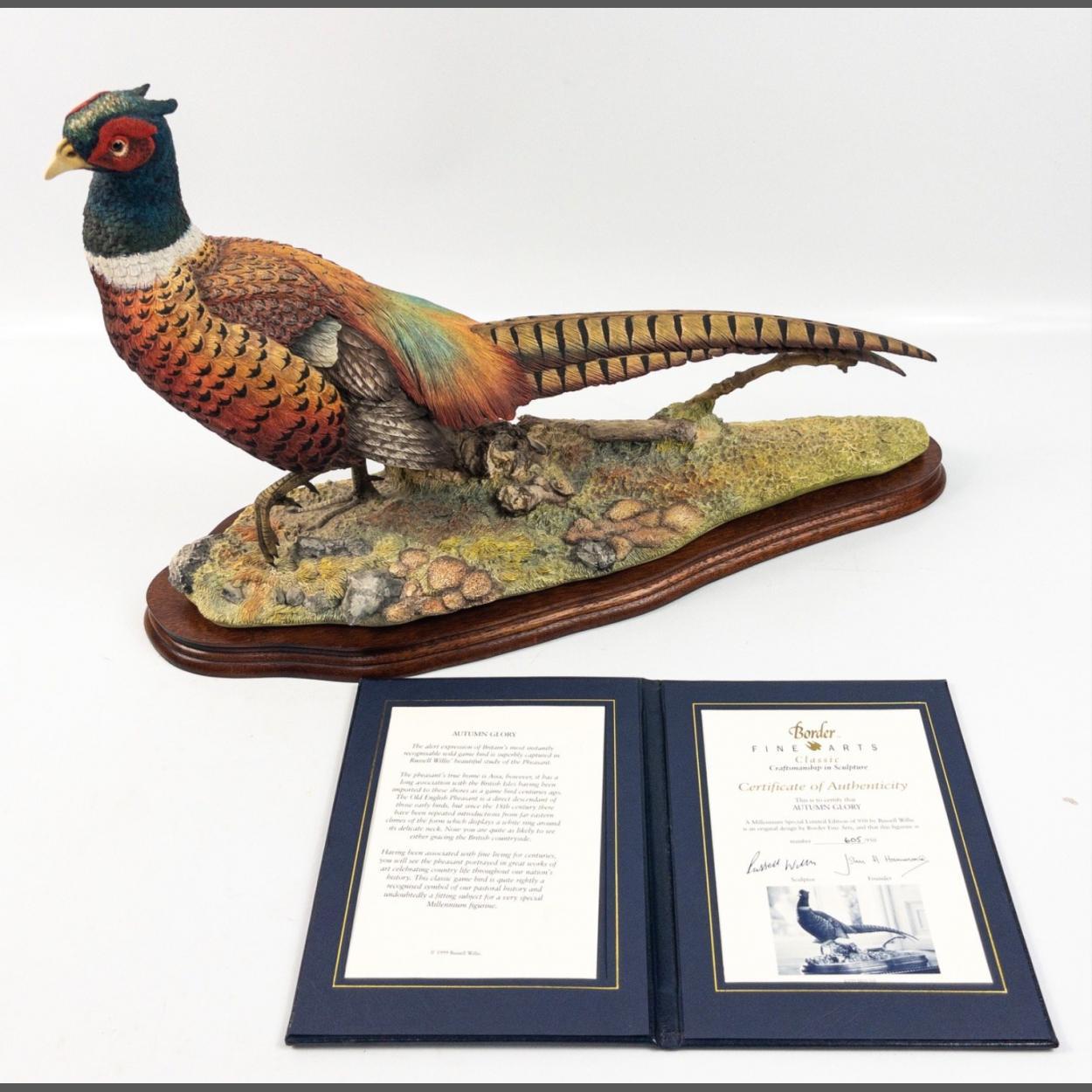 A large limited edition BORDER FINE ARTS life sized pheasant " AUTUMN GLORY " number 605 of 950 by Russell Willis complete on wooden plinth and with original 1999 certificate , the figure is in very good condition and is free from damage of any sort , approx length 50cm