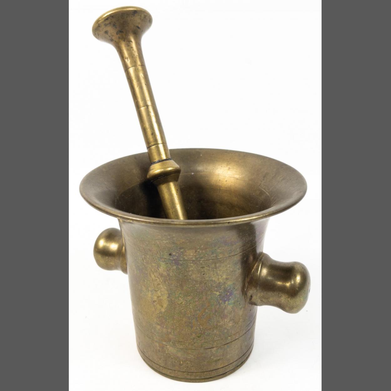 Substantial nineteenth century brass mortar and pestle with side handle. 14cm high approx. Pestle measures 26cm long. Some honest dings from use on the body but in lovely overall condition.