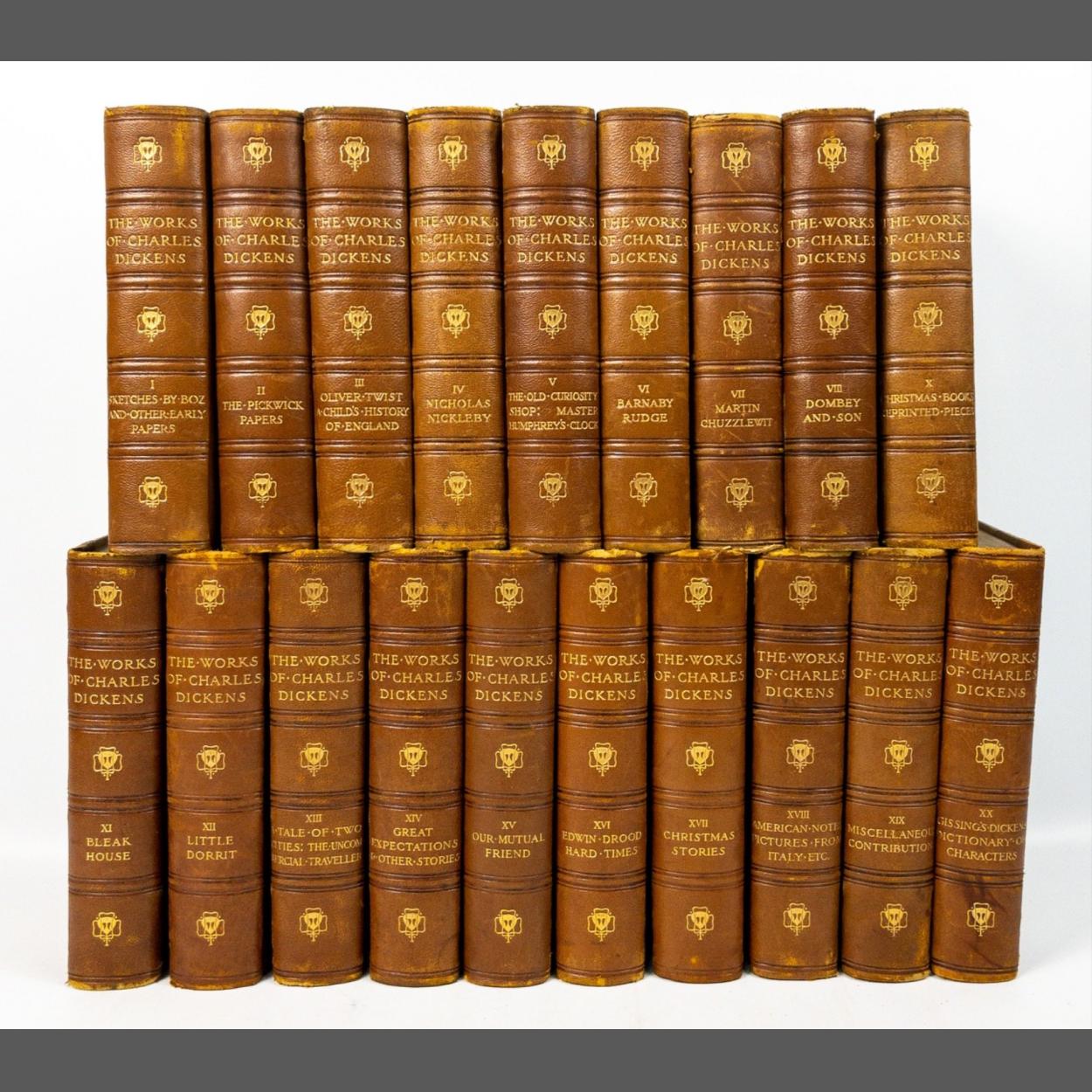 A part set of The Works of Charles Dickens(one book missing Oliver Twist) 19 leather bound books in total by The Gresham Publishing Company 1912