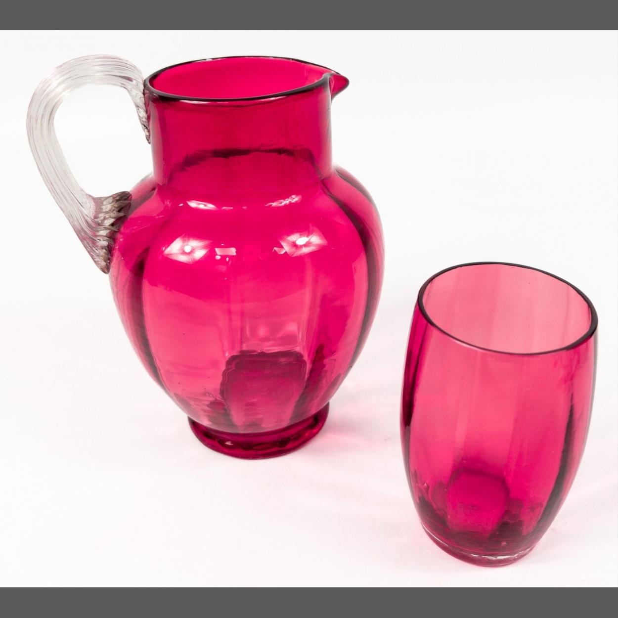 A beautiful Victorian cranberry glass water jug and matching tumbler. Hand blown glass with pontil to bottom and applied slayed handle. A very nice example in good condition. Jug measures 15cm high approx