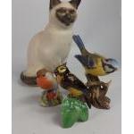 A ceramic SIAMESE cat 20cm tall and 3 small ceramic birds by various makers
