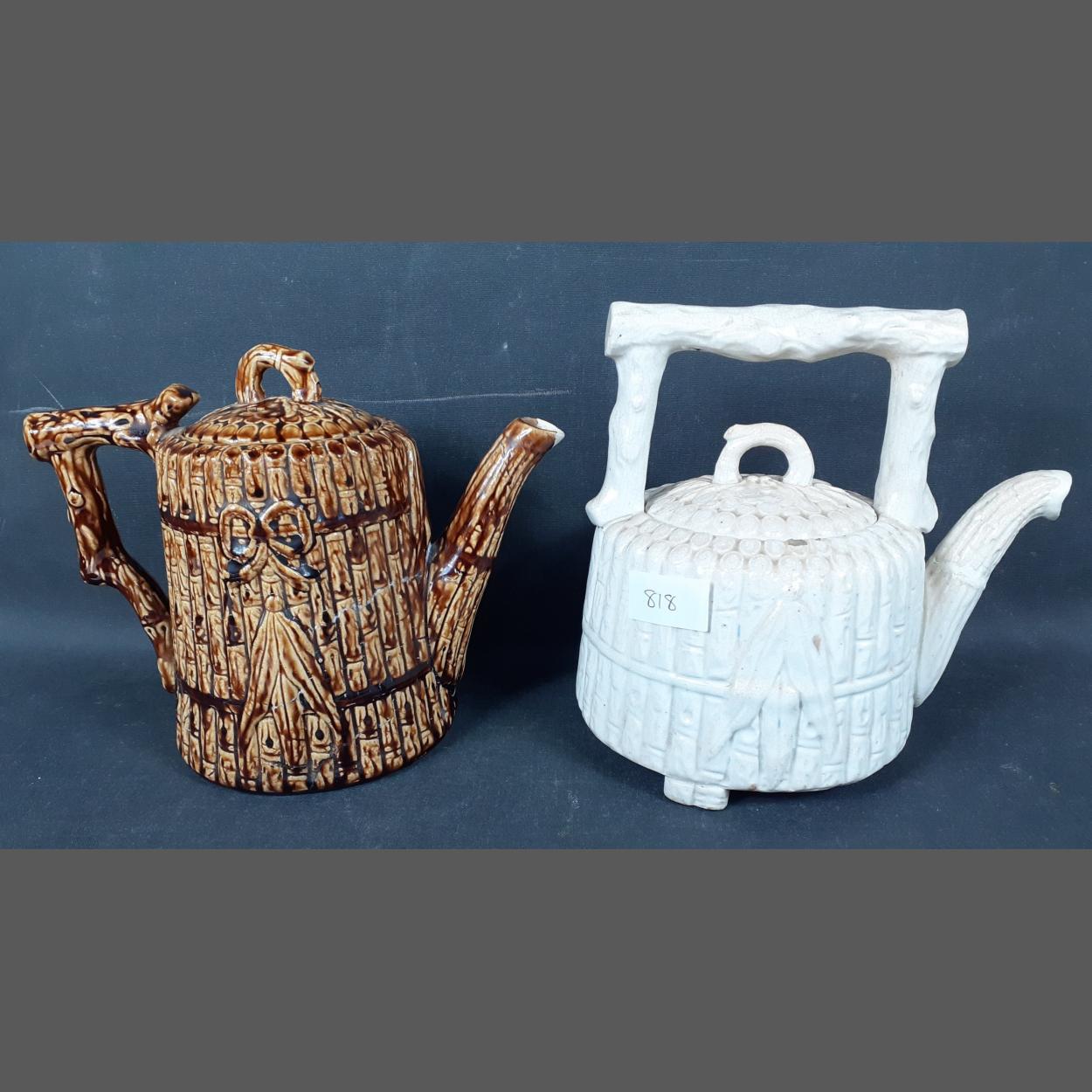 Two vintage teapots , treacle glazed BELFIELD of PRESTONPANS with repair to spout and a SCOTTISH POTTERY cream coloured pot with indistinct mark to the base