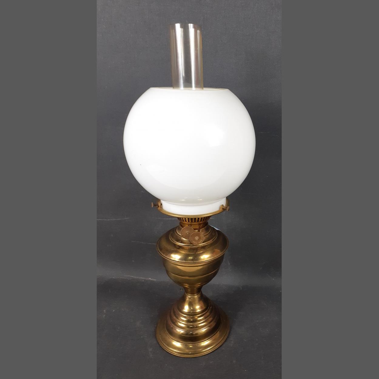 A brass oil style lamp with white glass shade and clear glass funnel, all intact - dimensions 50cm tall 14cm diameter at the base approx