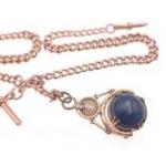 A nice 375 stamped yellow gold watch chain with yellow metal and blue stone fob, chain on its own weight 35g, total gross weight 41.20g approx