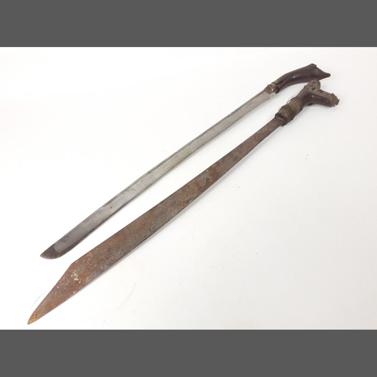 Two Indonesian / Balinese straight blade KRIS / KERIS style swords with wooden hardwood handles. Each approx 70cm total length. No scabbards, some damage to hardwood handles and grip wire.