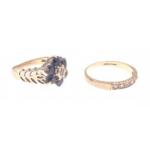 Two 9ct stamped rings to include a floral form ring with black stones and a single centred white diamond(tested) ring size L gross weight 2.96g approx with also a 375 half eternity yellow gold with 4 small white stones - ring size P weight gross 1.85g