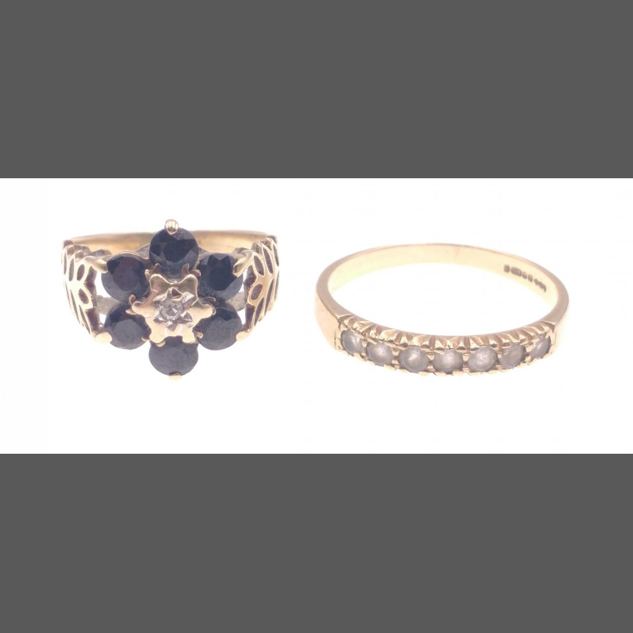 Two 9ct stamped rings to include a floral form ring with black stones and a single centred white diamond(tested) ring size L gross weight 2.96g approx with also a 375 half eternity yellow gold with 4 small white stones - ring size P weight gross 1.85g